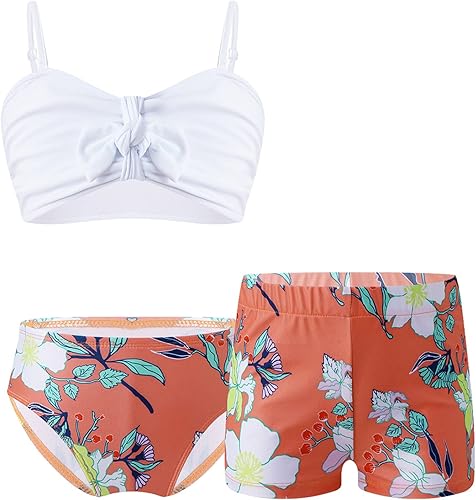 3Pcs Kids Girls Adjustable Straps Bowknot Knotted Front Top and Floral Print Boyshorts Briefs Swimwear