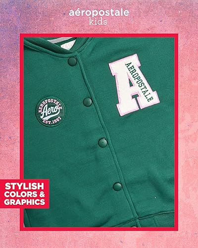Girls' Clothing Sets Makes Her Stand Out: This AEROPOSTALE girls tracksuit set, featuring a varsity-inspired button-down fleece jacket, uniform jackets for girls, kids bomber jacket, baseball jacket and matching joggers for girls. Fun logo patches, contrast sleeves, and ribbed trim create a playful, on-trend vibe that works for school days, playdates, or just showing off her style on the go.