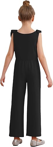 Aislor Kids Girls Wide Leg Jumpsuit Casual Sleeveless Bowknot Wide Shoulder Straps Romper Playsuit with Pockets Black 5-6 Years