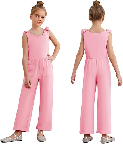 Aislor Kids Girls Wide Leg Jumpsuit Casual Sleeveless Bowknot Wide Shoulder Straps Romper Playsuit with Pockets Pink 7-8 Years
