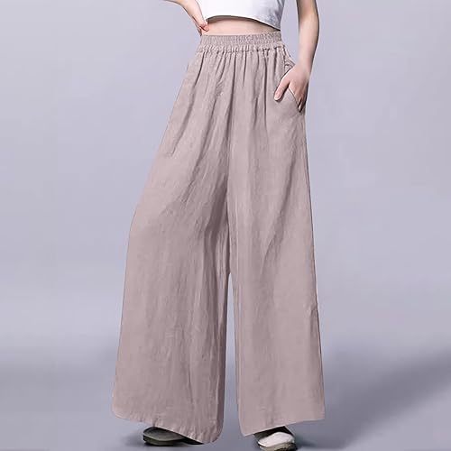 Akklian Wide Leg Pants Woman Cotton Linen High Waisted Beach Flowy Culottes Summer Comfy Lightweight Lounge Pants with Pocket(Beige,X-Large)