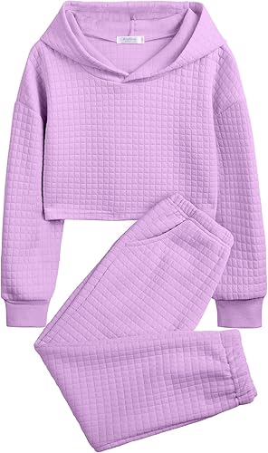 Feature: Girls sweatsuit sets with plaid jacquard fabric,the hoodied sweatshirt features pullover, full sleeve ,waffle, drop shoulder, solid color; the jogger pants feature simple color, sloped pockets, high elastic waistband