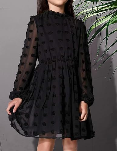 Features: Casual and stylish elegant girls dress for your princess. Two layers, full liner and not see-through. Elastic waist design, girls can breathe freely without strangling. Sheer Long sleeve, ruffle collar, swiss dots, swinging with each step.