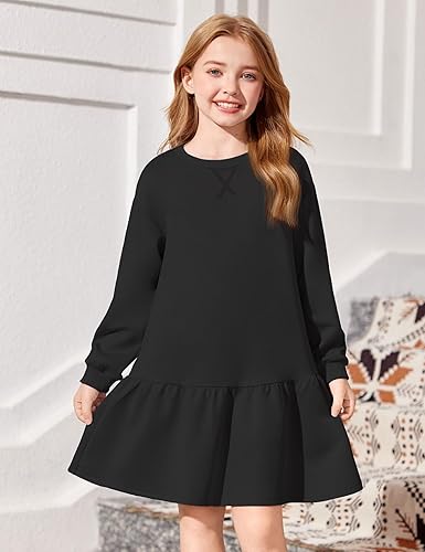 Features: Girls long sleeved dress that casual oversized design, also with round neckline, a relaxed fit with a rib knit A-line silhouette, while the dropped shoulders, elastic waist with side pockets, tiered hemline,combines elegance and comfort for a chic look.