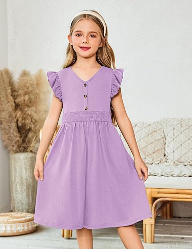 Feature: Casual swing dress for your girls with A-Line style, V-Neck, Flutter Sleeve, Elastic Waist, Two Side Pockets, Solid/Pattern Color, Knee Length. It is a nice choice for girls holiday dresses.