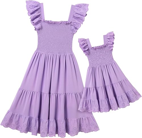 Tiered Smocked Dress: slim fit knee long flowy A-line dress style women girls flutter sleeve smocked tiered dress, ruffled flounce sleeve and tiered dress hem flaps beautifully by each move, flatters bodyline and highlights elegance, hollow out desigh mom and daughter boho dress looks trendy and chic, you and your daughter will love this mama and daughter boho dress mommy and me summer casual holiday dresses.