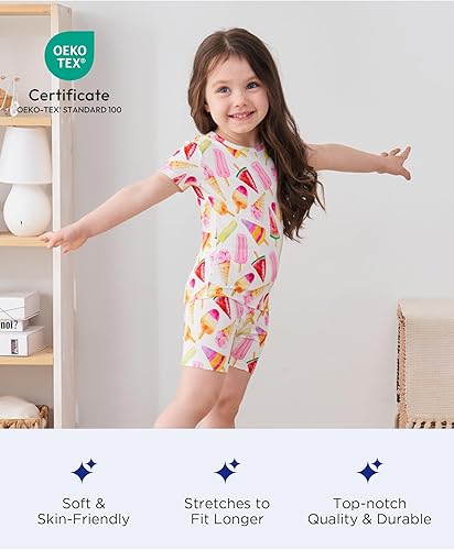 FOR SENSITIVE SKIN: Toddler girl summer pajamas made of 95% Viscose from Bamboo, 5% Spandex are SUPER SOFT, SILKY and BREATHABLE. Tagless label on the neck of our sleep set ensures your child has the ultimate in comfort. Great gift for baby's skin