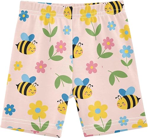 Bee Blue Flowers Girls Bike Shorts Toddler Soft Cotton Active Biker Shorts(Multi-bee Blue Flowers,5T)