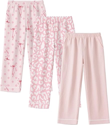 Betusline 3 Pack Girls Pajama Pants Comfy Soft PJ Bottoms for Kids, Bow Dots Pink/Leopard Pink/Light Pink, 7-8 Years = Tag 140