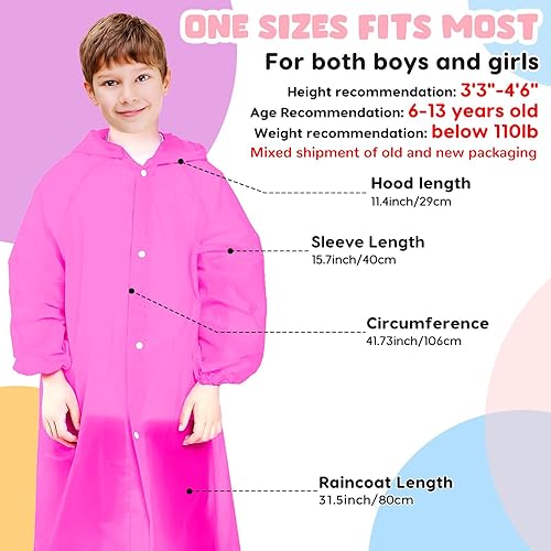 Perfect It Most: Pink Colors,suitable height: 3.6-5.25 feet, usually fit for 6-12 years old children, Unisex waterproof ponchos, one size fits most, perfect for boys and girls.Full-length reusable raincoat with hood and elasticated sleeves to keep water out