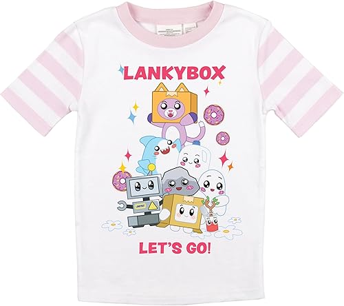 CUSTOM DESIGN: This two-piece Lankybox pajama set includes sleep pants and a short-sleeve t-shirt. The top features a big colorful graphic of their favorite characters and "Lankybox Let's Go!", while the bottoms boast an eye-catching pink-and-white striped pattern.