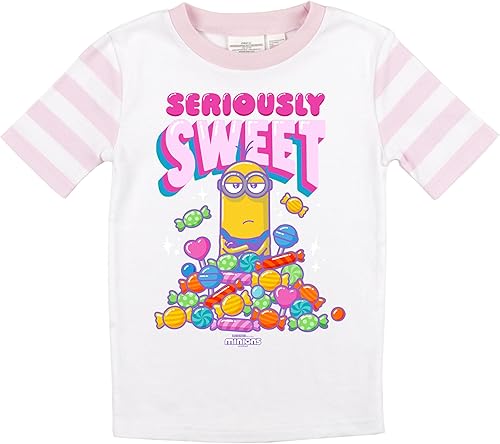 CUSTOM DESIGN: This two-piece Minions pajama set includes sleep pants and a long-sleeve t-shirt. The top features a big colorful graphic of a minion perched atop a pile of "sweet" things, while the bottoms boast an eye-catching pink-and-white striped pattern.