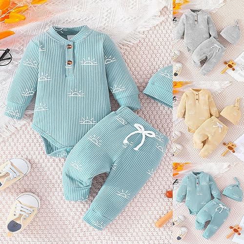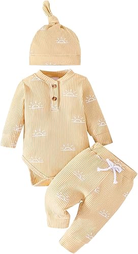 Birthday Clothing for Baby Boys Girls Cotton Outfits Set Ribbed Long Sleeve Sun Print Button Design Romper with(Yellow,6-9 Months)