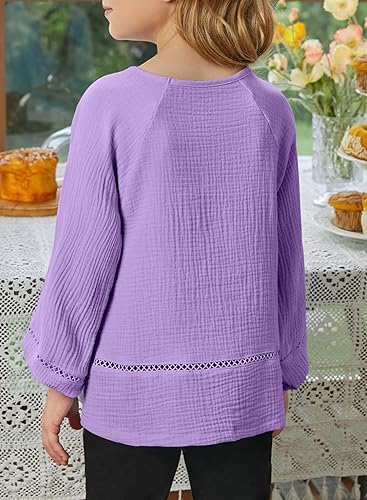 FEATURE: Cotton Fabric, Plain Solid Color, Lantern Long Sleeve, V Neck, Hollow Design, Elegant Style, Loose Fit Girl Outfit.
