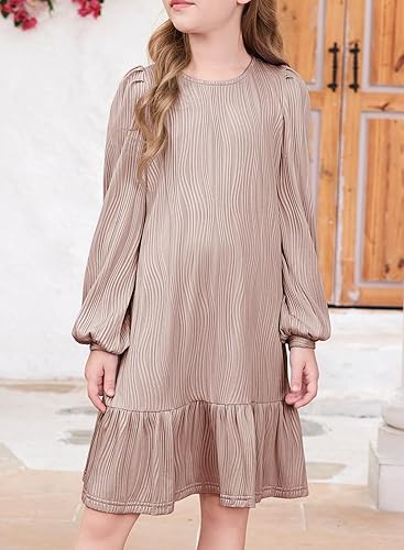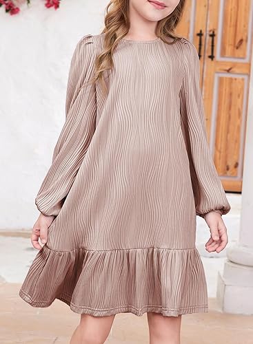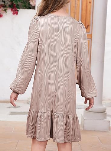 FEATURES: Elevate your girl's wardrobe with our trendy textured girl long sleeve dress, featuring an exquisite pleated texture, high elasticity, a solid knit design and vintage style. Also it exudes elegance with its round neck, loose fit and lightweight silhouette, and knee length. It's the perfect choice for fashion-forward girls who value both style and functionality