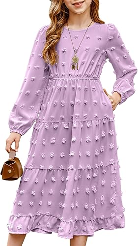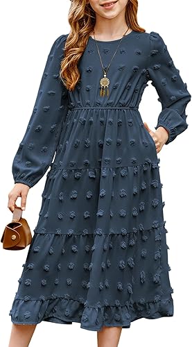 FEATURES: This girls maxi dresses features a crew neck, puff long sleeve, tiered hemline and polka swiss dot design. Its suitable for your kids to wear in daily or special occasiaons.