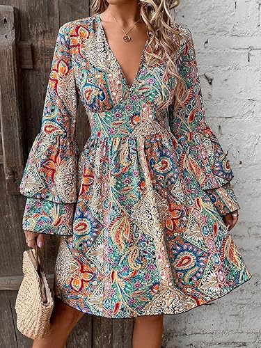 STYLE: Boho-inspired dress featuring a vibrant paisley and floral print pattern with a flattering V-neckline and empire waist design