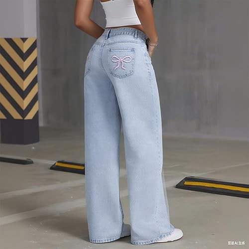 Design: Intricate bow embroidery on bow jeans and jeans with bows, featuring girls wide leg jeans and baggy jeans for girls 10-12 cuts - perfect for bow jeans for girls and girls bow jeans enthusiasts.