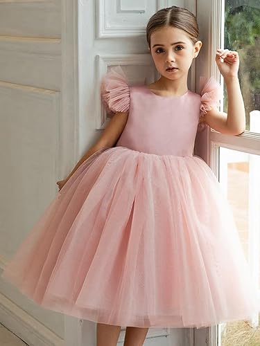 Features: The flower girl dress features a crew neck design with ruffle sleeves, which are made of satin and tulle material, The back features zipper closure exposed design, it is an elegant girl princess party dress and children's beauty pageant dance dress