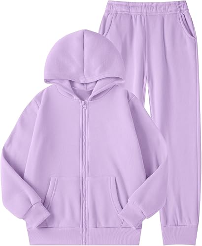 【Trendy Design】Girls' clothing sets, zip up hoodies sweatsuit set, 2 piece outfit for girls. Oversized drop shoulder hoodie gives you more space in the shoulders and arm parts, no limits to make any movement even in winter. Y2k fleece casual style and oversized sweatsuit kangaroo pocket. Matching high waist sweatpants has elastic waistband and drawstring to match all figures adjustment