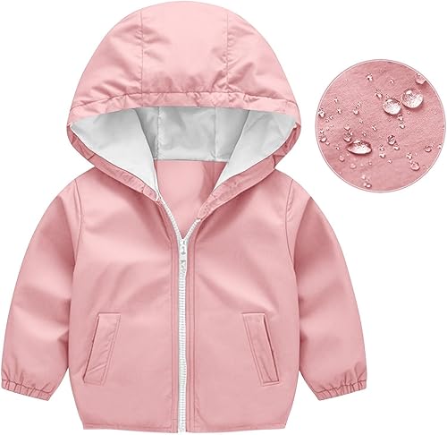 Boys Girls Rain Jacket Kids Zip Up Hooded Windbreaker Waterproof Outerwear Raincoats Fall Winter Outdoor Coat(Pink,12-18 Months)