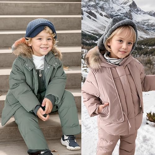 KIDS SNOWSUIT: Our baby winter snowsuit set is made of high-quality polyester fiber, and the filling content of white duck down is as high as 85%. Soft, lightweight and warm, no pilling, no fading. Suitable for cold winter.