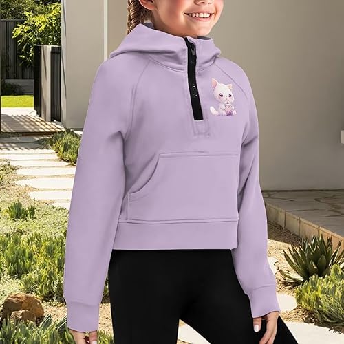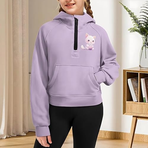 Cute Girls Zipper Hoodie: Half zip up neckline with adjustable collar height, cozy plunge sleeves with kangaroo pockets for protection from the elements, loose fit, short pullover top with elasticized ribbed cuffs and elasticized hem, easy to put on and take off, windproof and warm, creating a casual and stylish look