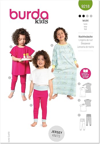 Create the enchanting nightgown, cute sleep shirt and leggings for girls with this Burda style pattern; the sleep shirt with cap sleeves promises maximum freedom of movement, while the leggings with contrasting cuffs create cool looks