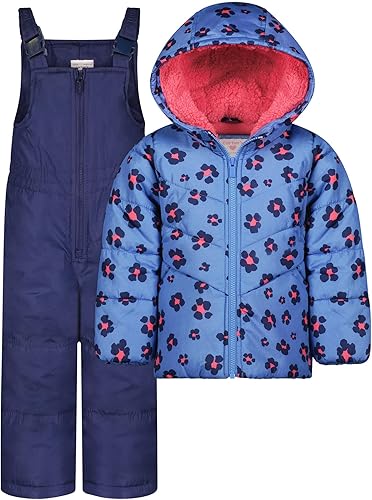 BUNDLE INCLUDES: 1 Carter's girls snow bib overall pants, 1 winter jacket, and 1 pair of kids magic gloves. Girls snowsuit has hypo-allergenic polyester filling for added warmth. Polyester filling is a great down jacket alternative for children or adults with allergies. Winter snowsuit has a water resistant and wind resistant outer shell. Girls ski snowsuit help keep kids warm and dry in the winter and while sledding, skiing, or just playing in the snow.