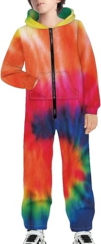 Casual Jumpsuits Girls Boys Long Sleeve Long Pants Hooded Romper for Kids Custom with Zipper Holiday One Piece Suit(Rainbow Tie-dye,Small)