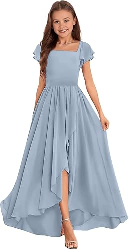 Flower girl dress features delicate square neck with flutter sleeves design, add a feeling elegance, high low A-line flowy floor length with deep V back design, the dress will make your girl so gorgeous and eye catching, zipper closure on the back, make the dress exquisite while be easy to wear and take off. This formal dress will bring your girl a memorable childhood at her special moments!