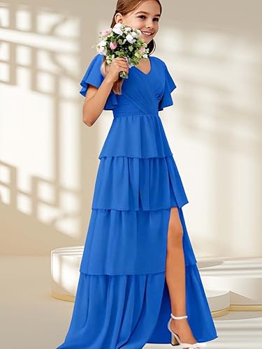 Exquisite design for little bridesmaid dress:A line floor length girls wedding dress,V Neck junior bridesmaid dresses,High-waisted design,Floor length girls prom bridesmaid dress,High slit pleated ruffle chiffon girls formal evening gowns,Flutter Sleeve flower girl dress,Corset lace up back kids formal dress,The jr bridesmaid dress has 2 layers,This prom dress for little girls can show the elegant figure of a girl