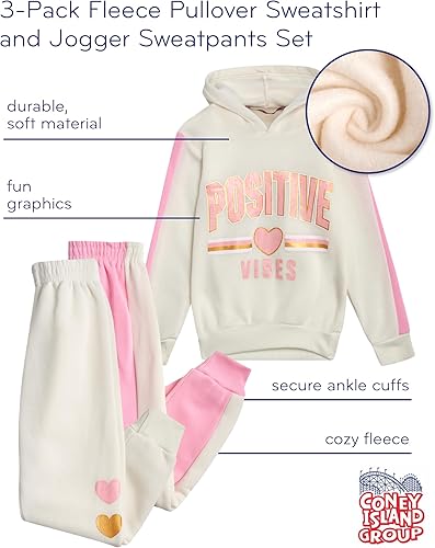 GIRLS' CLOTHING SET: With this jogger sweatpants and hoodie sweatshirt set for toddlers and little girls, your baby daughter gets a super soft pullover hoodie and two pairs of active joggers; Each 3-piece clothing set for kids comes in a variety of colors and fun prints that are suitable for a variety of occasions and will make your daughter look extra cute; Stamped with the classic Coney Island logo, your little daughter will love wearing this active sweatsuit set