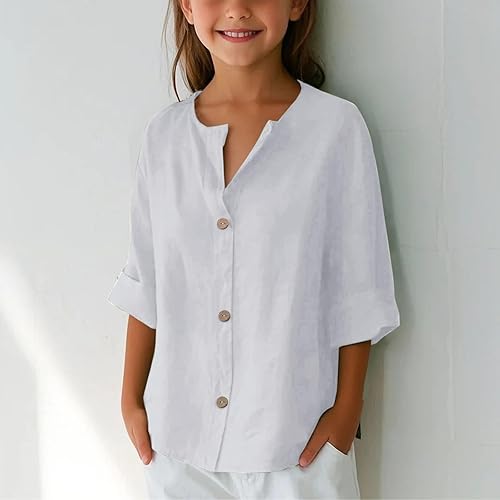 Cotton Linen Shirts for Girls Plain Buttons Beach Casual T Shirts Tops Summer V Neck 3/4 Sleeve Open Front Tops(White,11-12 Years)