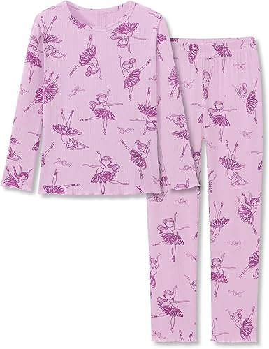 Feature: These girls' pajamas feature a playful all-over ballerina cartoon character print on a soft violet background, with a round neckline and long sleeves on the top paired with the matching pants. Designed with a classic crew neck and an elastic waistband for easy on & off, and finished with a charming lettuce hem that adds a touch of femininity and fashion to these outfits.