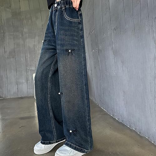 Cute Jeans for Teen Girls Butterfly Wide Leg Jeans Elastic High Waist Baggy Denim Pants Trendy Vintage Bottoms(A-blue,11-12 Years)