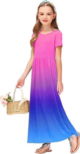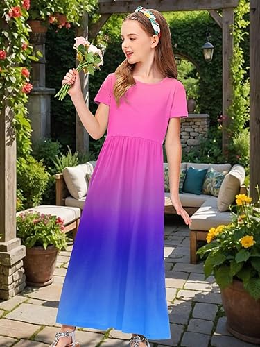 Girls Gradient Dress Features: Round Neck Elastic High Waist Floor Length Dress with Side Pocket Design