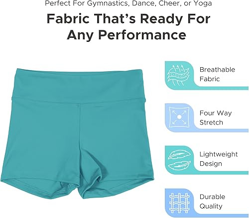 Activewear Performance Fabric: Our athletic high-waist shorts come with features that include a stay-put waistband and longer inseam. These ensure comfortable compression, and they wonÕt ride up for any distractions when performing your next handspring or salto. Our buttery soft, elasticated waistband won't pinch or squish. Perfect for gymnastics, tumbling, cheer, yoga, acrobatics and event or team apparel