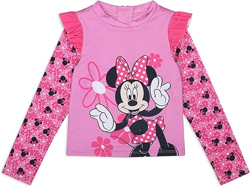 Make dressing easy and hassle free in this Minnie Mouse rash guard set. Available in toddler sizes Minnie Mouse sizes 2T girl clothes, 3T girl clothes, and big kid sizes 4 girl clothes, 5 girl clothes, 6 girl clothes, and 6X girl clothes.