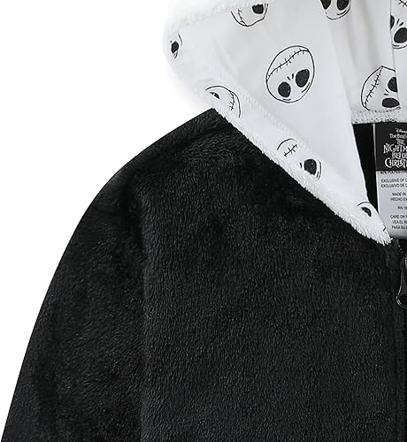 Featuring a black hoodie with Jack Skellington and Zero the ghost dog print, topped with white Jack Skellington hood. Designed for comfort with a full zip front, long sleeves, and ribbed cuffs and waistband for a snug, easy to wear fit.