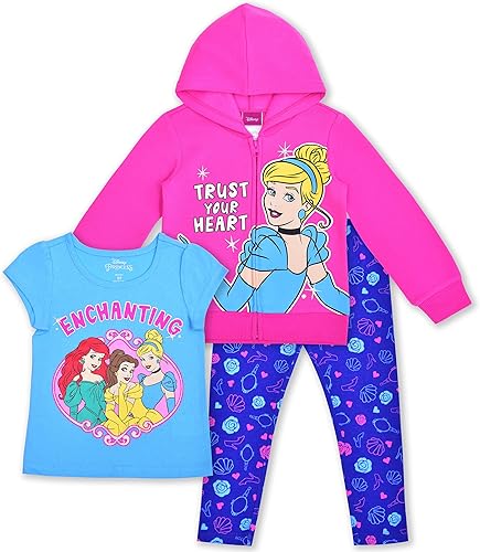 Cool and Stylish Disney Princess Ariel, Cinderella and Belle Zip Up Pullover Hoodie, Short Sleeve Tee and Leggings Set for Toddler and Little Kids. The Princess Girls Clothing Sets for Your Little Girl