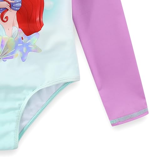 Contains a vibrant purple and green long sleeve rash guard swimsuit featuring The Little Mermaid surrounded by a charming print of seashells, starfish, and bubbles.