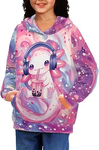 DISNIMO Kawaii Clothes for Girls Active Hoodies Long Sleeve Pullover Shirts(Milk Tea Axolotl,11-13 Years)