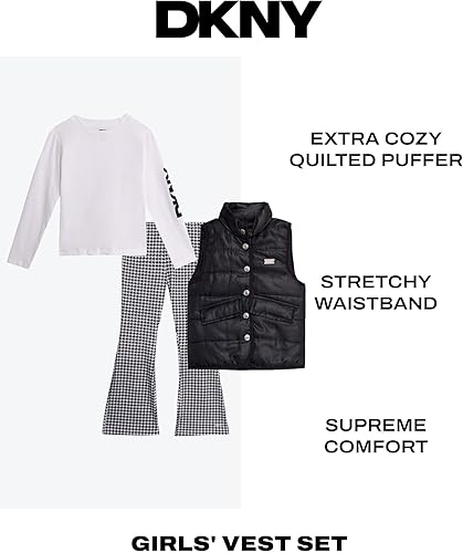 AUTHENTIC DKNY: Relaxed Fit Long Sleeve Shirt, Quilted Puffer Vest, and Retro-inspired Flare Leggings Set; The dynamic wardrobe of everything you need to live a New York life-wherever that may be