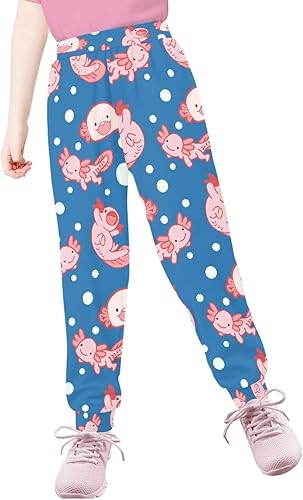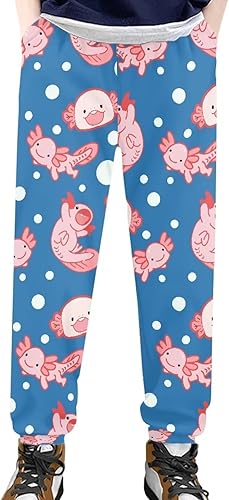 Dreaweet Cute Sweatpants for Girls Boys, Kids Graphic Jogger Pants 4-15 Years Casual Athletic Trousers with Pockets(Axolotl Cartoon,8-9 Years)