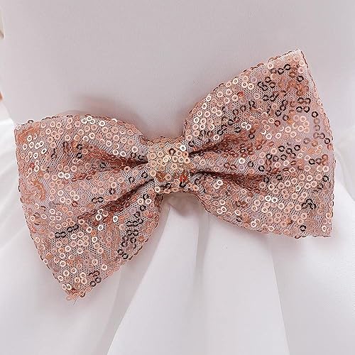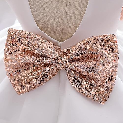 Fully lined sleeveless satin bodice with round neckline. Features an extravagant V back with hidden zipper closure for easy dressing. A rose gold sequin bow attached at front waist and a detachable one at back add a touch of gracefulness!