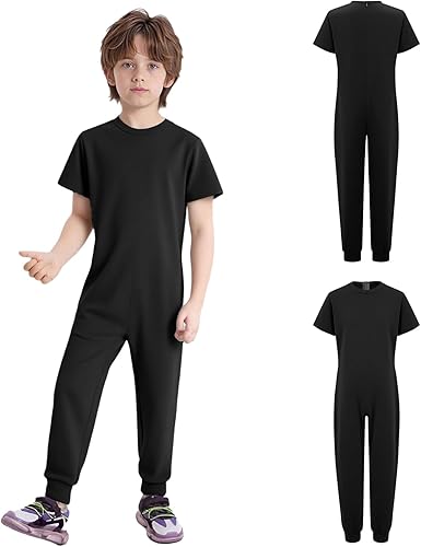 easyforever Kids Boys Girls Short Sleeve Anti-Strip Jumpsuit Romper Adaptive Clothing with Back Zipper for Special Needs Black 8 Years