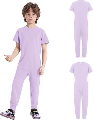 easyforever Kids Boys Girls Short Sleeve Anti-Strip Jumpsuit Romper Adaptive Clothing with Back Zipper for Special Needs Lavender 10 Years