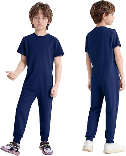 easyforever Kids Boys Girls Short Sleeve Anti-Strip Jumpsuit Romper Adaptive Clothing with Back Zipper for Special Needs Navy Blue 12 Years