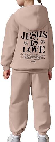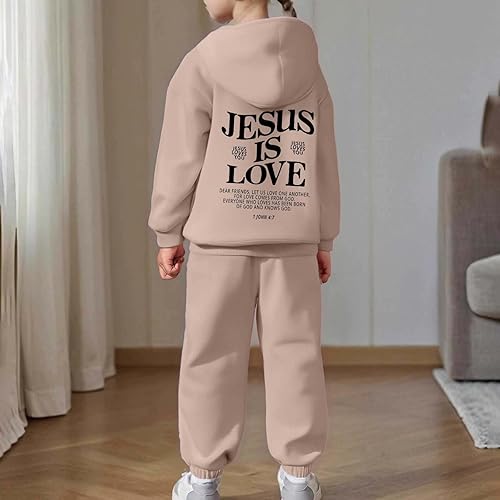 Design: Girls 2 Piece Outfits Sets features faith inspired Jesus prints like "Trust In The Lord" and "Jesus Is Love", a hooded sweatshirt, and cinch bottom jogger pants, creating a trendy 2 piece tracksuit set